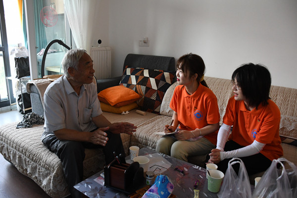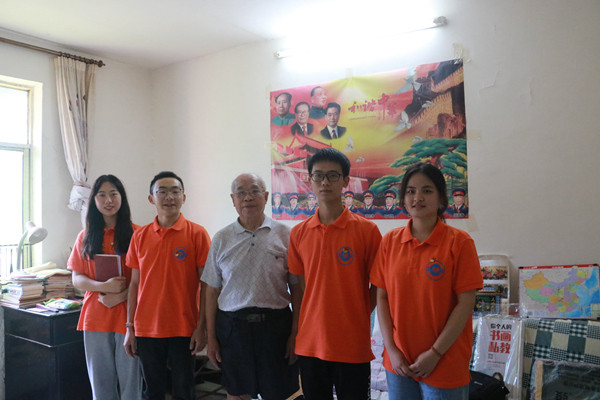 吃过午饭后,志愿者们便前往老党员杨经章爷爷家。杨爷爷今年82岁,在党已经58年,是从兰州404师来到涪陵参加816地下核工厂建设。杨爷爷回忆起自己在816核工厂印象最深刻的事,他说自己是北方人,刚来时饮食和住宿都不习惯,特别是当时住的房子比较矮小,自己站起来就快到顶了,天气也特别炎热,所有男同志女同志都在同一条小水沟洗澡,条件特别艰辛。特别是有一次,杨爷爷护送文件去重庆,赶上了重庆的文化大革命,被困在那里回不来,最后只穿着裤头和背心,只能回老家,回到老家之后,他才穿上衣服。回忆起往昔的经历,杨爷爷十分感慨,他跟志愿者们说:“军人有军人责任、军人的使命、军人的担当。在当时那个年代,舍身忘死是我最好的价值体现。志愿者们问起杨爷爷作为一名光荣在党50多年年的老党员,平时对自己有哪些特殊要求。杨爷爷说,自己始终保持对先辈的付出的感恩,努力传承和发扬先辈的精神,同时也非常积极的让后辈了解“三线”精神,希望后辈们可以将这种精神发扬光大。