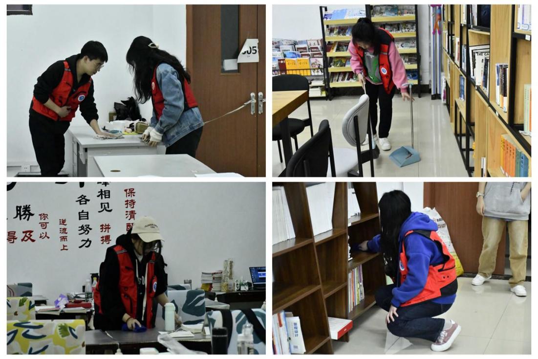 在打扫自习室的过程中,志愿者们手持扫把、拖把等工具,以认真的态度,高质量地完成了地板清扫任务。志愿者们还对阅览室的窗户、桌子等进行了仔细地擦洗。最后,自习室大扫除实践活动在志愿者们的集合拍照留念中落下帷幕。