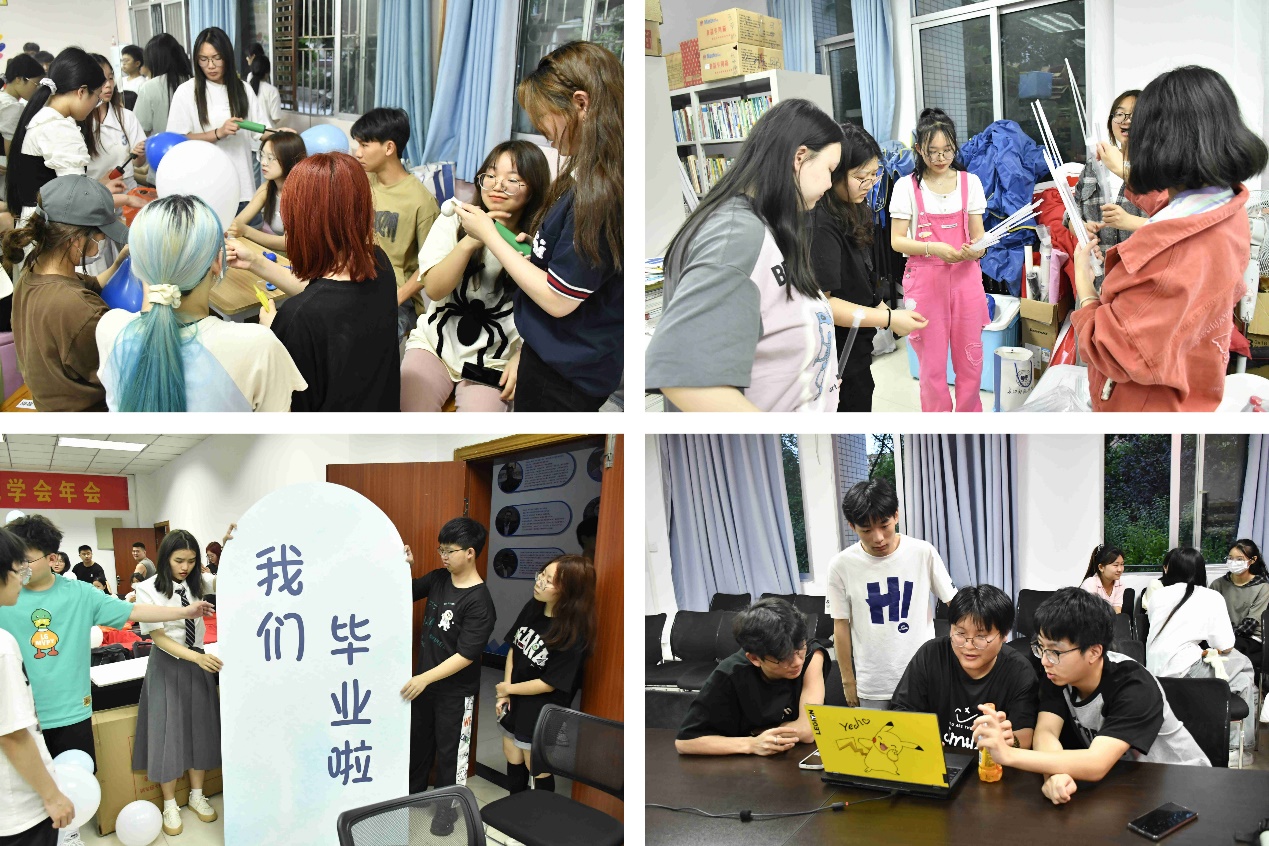 随后,各部门于崇信楼104、202、209会议室有条不紊地开展相关工作。各部门同学各司其职,积极开展相关准备工作。同学们吹气球、搬运桌椅板凳、摆放照片墙,对典礼主席台桌椅、桌布,场地地毯等进行铺设布置,一切就绪的毕业典礼会场背后浸透着工作人员辛勤的汗水。最终,同学们以高标准的要求完成了典礼前的准备工作,每一个细微之处都折射出他们精益求精的工作态度。历经多次学校大型活动的检验,员工会成员们靠扎实勤恳的作风和高效优质的服务,为学院各类大小会议及重要活动提供了有力的保障。