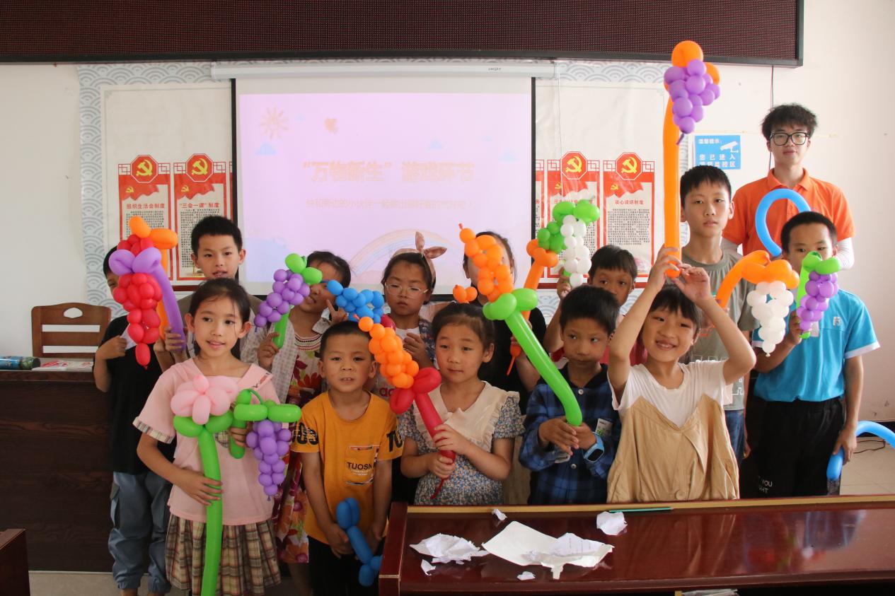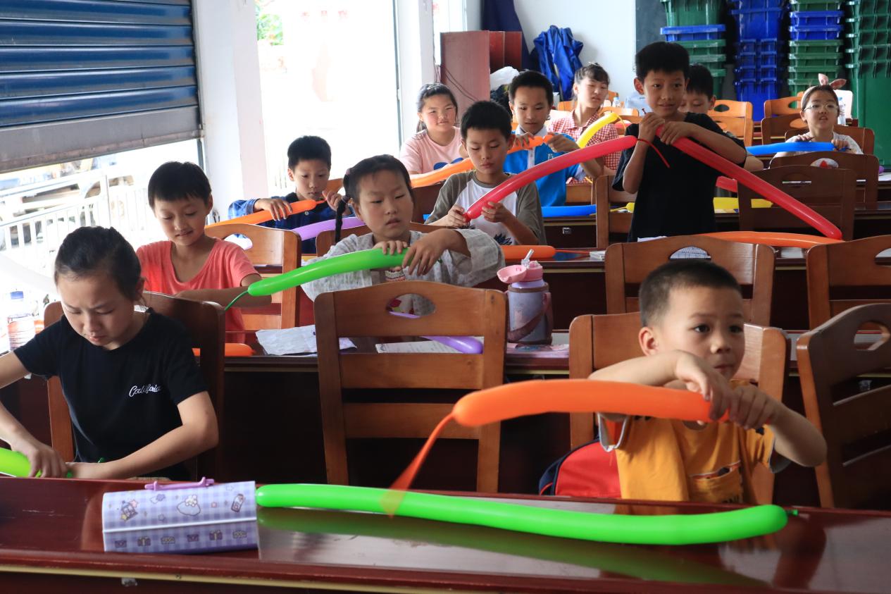 志愿者们为孩子们开展了一堂富有创意的手工课——制作花样气球。志愿者们首先将一个个五颜六色的长条气球分发给小朋友,他们引导孩子们按照自己的想法来设计气球造型,让他们享受创作的乐趣。经过孩子们的努力,异彩缤纷的气球作品摆满了桌子,孩子们做出了小狗、葡萄、花朵,造型各异,孩子们的脸上都挂满了开心满足的笑容,充满了成就感。