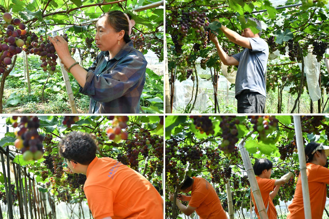 时令当下,晞昱葡萄园基地迎来了丰收的季节,在纵横交错的葡萄藤架下,志愿者们见到了一串串晶莹剔透的紫红色葡萄。葡萄基地负责人刘宾夫妇热情地向志愿者们介绍了目前种植面积、产量等情况,因为葡萄品质不错,口感香甜,有良好的口碑,所以经常供不应求。但基地负责人刘宾说道:“其实刚开始种植的时候,葡萄产量低下,品质不高,那时候愁啊,为技术着急,后来政府开设了一个培训班,派了一些专业技术人员来教授相关技术,我们就跟着他们学习”,在政府的大力帮扶下,葡萄从20亩增产到100亩,基本形成了区域化种植、规模化经营、社会化服务,葡萄真正成为了刘宾的“致富果”。