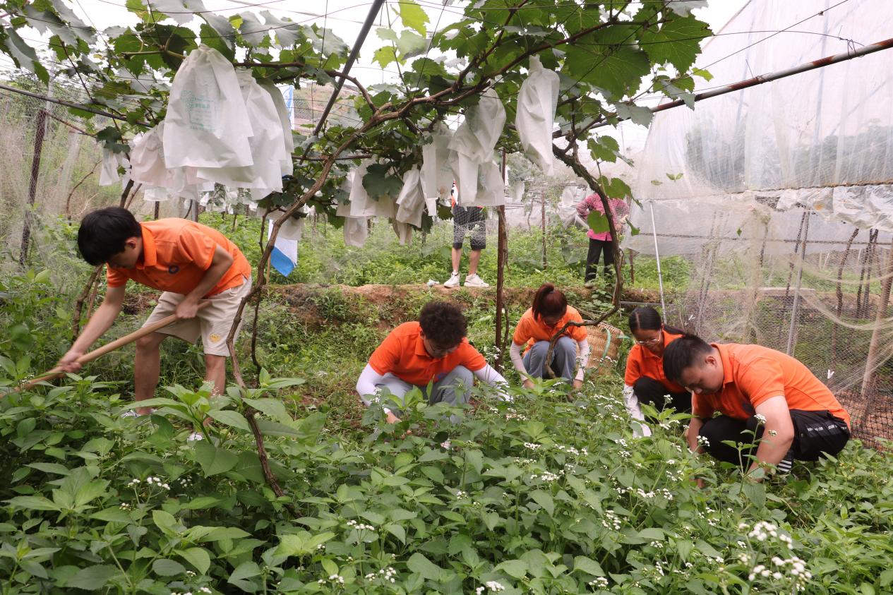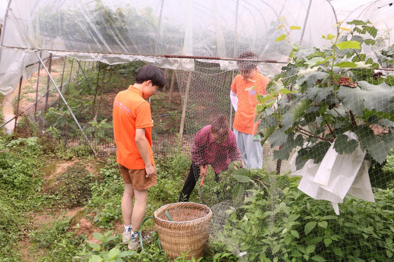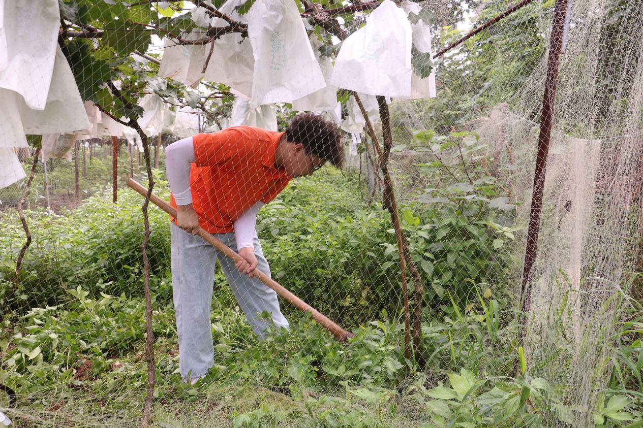 上午10时,志愿者们在当地村民的带领下,来到“晞昱葡萄种植合作社”葡萄基地。村民首先为志愿者们示范了如何打理葡萄园的杂草,随后,志愿者们纷纷拎起镰刀、锄头等农具开始劳作,烈日炎炎下,一群橘红色的“小蜜蜂”在葡萄园中显得格外亮眼。经过两个小时的努力,杂草基本上被清理的干干净净,虽然大家已经汗流浃背,但是感觉充实又开心。