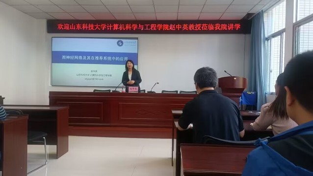 赵教授及其团队主要研究方向是是图神经网络的应用,本次报告分享了其团队近年来在图神经网络领域开展的研究工作,包括双重特征交互的图卷积、图结构学习等,并探索图神经网络在推荐系统中的应用等。与会教师感觉收获颇丰,并与赵教授进行了会后交流。