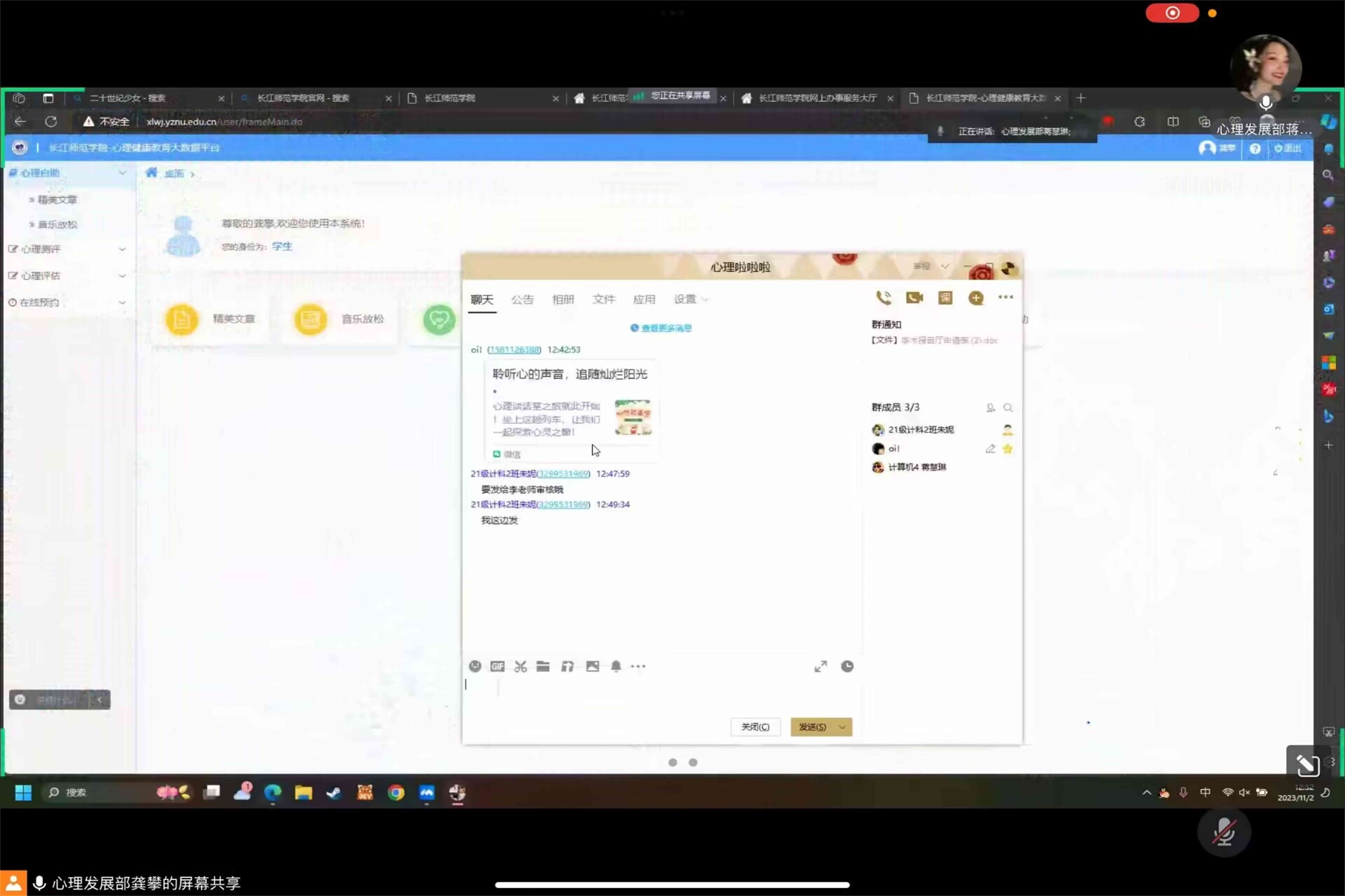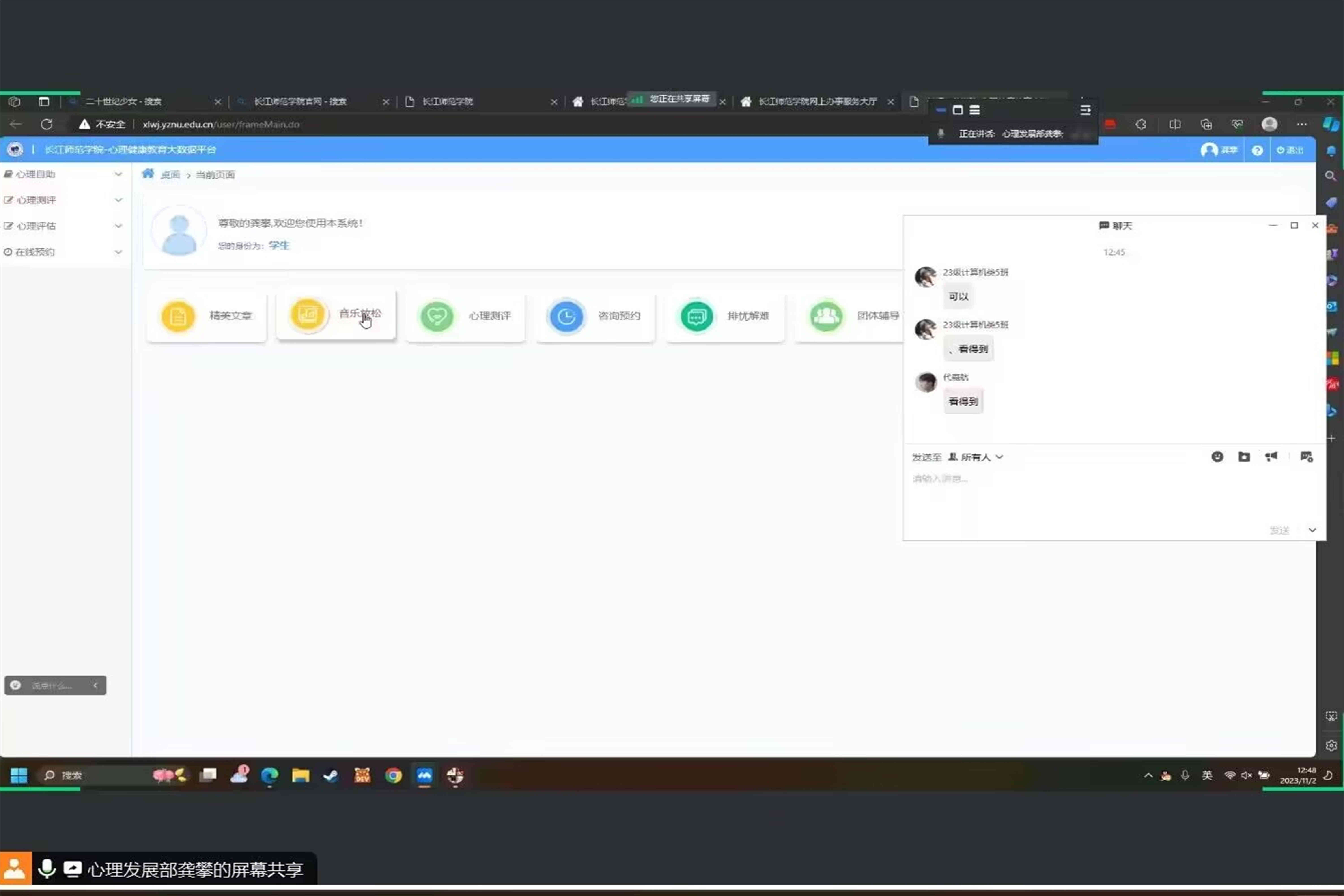 会议伊始,龚攀同学通过屏幕共享的方式,向各班心理委员讲述心理健康状况反馈的操作步骤。同时,他强调了心理委员的工作,希望各心理委员能履行好自己的职责,不断增强沟通能力和观察力,与班上同学积极沟通。