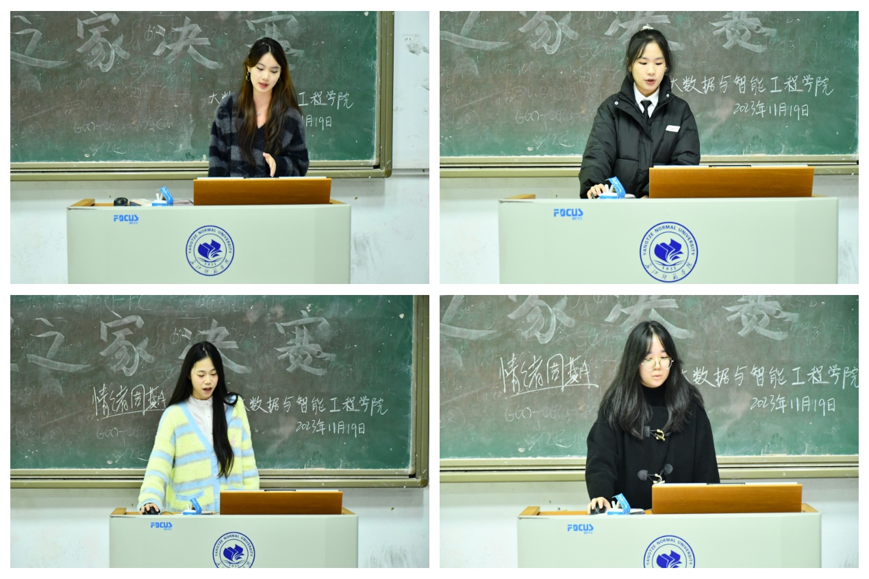 参赛选手主要从老员工现状、心理状况和具体方案等方面进行了演讲。其中南苑一舍604寝室以“太空探索,追寻寝室心理之家”为主题,为大家介绍了他们寝室的特殊氛围,他们用制定学习计划以及寝室公约等方法来规范自己,并定期举行特色活动缓解压力。选手声音嘹亮,精神饱满,将自己的团体特色表现出来,获得了大家的热烈掌声。