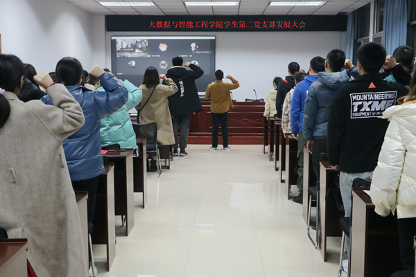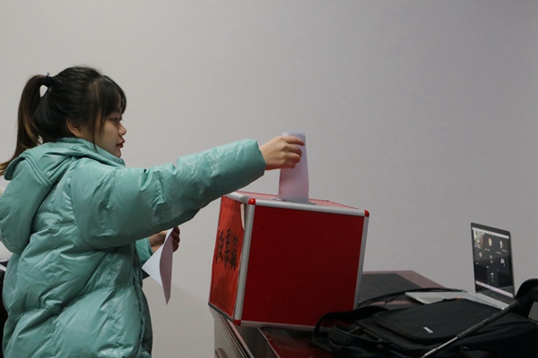 紧接着,具有投票权的党员对接收预备党员进行了投票表决,全体党员一致同意发展对象成为预备党员。随后,发展对象宣誓,他们高亢激昂,声音久久回荡在会议室。