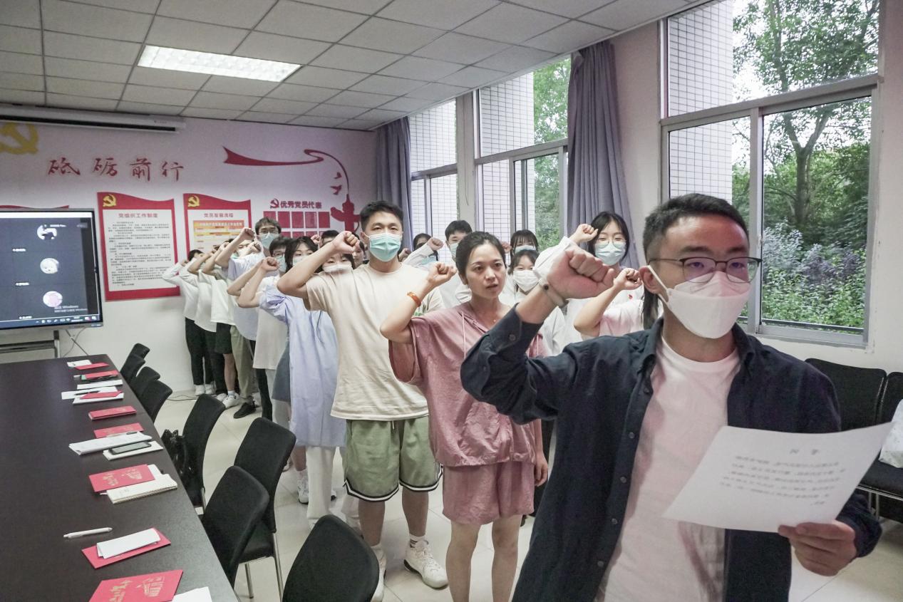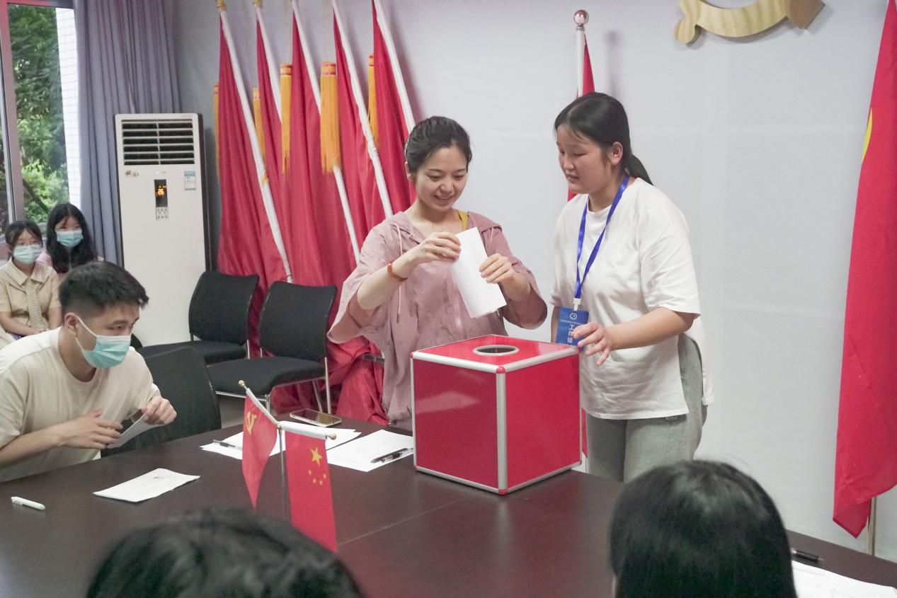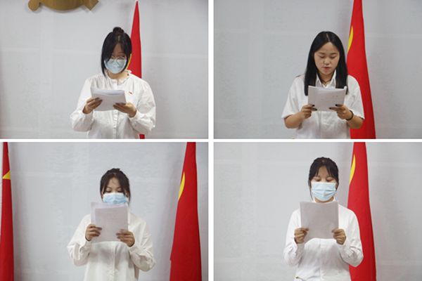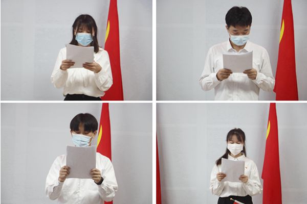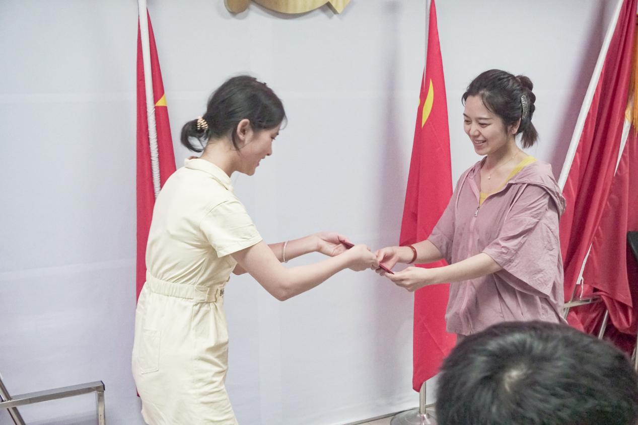 待八位入党积极分子宣读完自己的入党申请书,员工第三党支部各党员进行无记名投票,曾楠楠、王宇薇、傅崧玲、谢梅菊、胡镟、袁莹徽、王嘉豪和赵学聪这八位同志均全票通过。他们在党员同志王骏辉的带领下,面向党旗宣誓。在六月迎来自己政治生日的第三党支部的正式党员,则从张珊珊同志处领取了生日贺卡,重温了入党誓词。