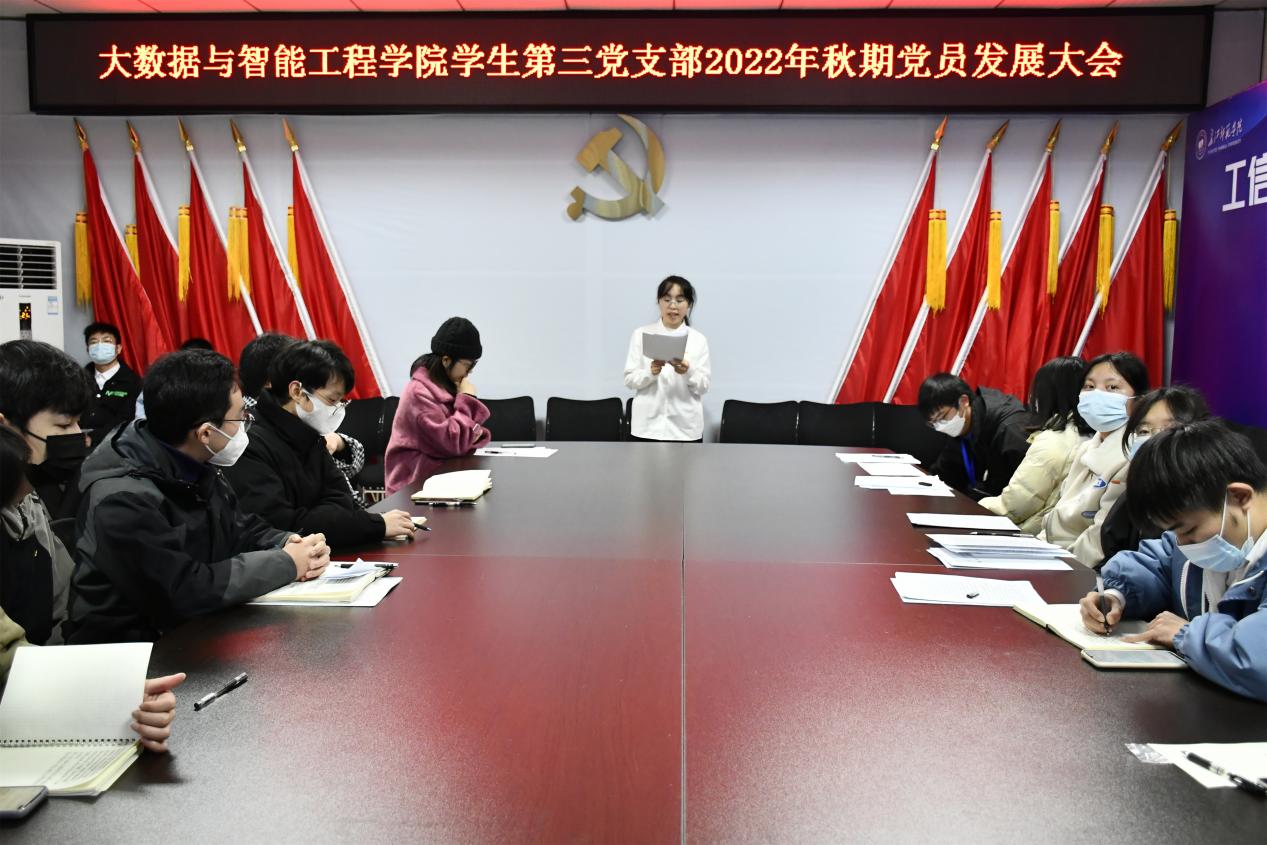 12月6日晚上7时,公司于崇信楼209党员活动室召开2022年秋期员工第三党支部党员发展大会。公司员工第三党支部书记张珊珊出席此次大会,员工第三党支部全体成员参加此次大会。